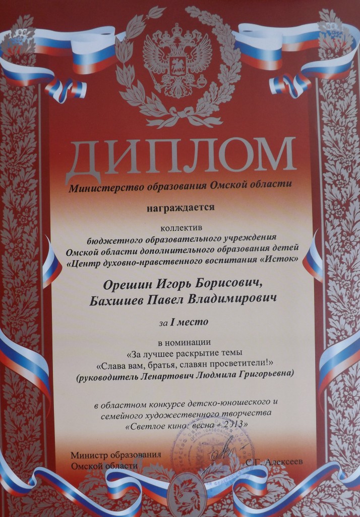 Конкурс посвящен Дню славянской письменности и культуры с целью приобщения подрастающего поколения россиян к духовно-нравственному наследию Отечества, возрождения детского, юношеского и молодежного кинематографа, выявления и популяризации фильмов талантливых авторов. Организаторами Конкурса «Светлое кино» выступили: Министерство образования Омской области, БОУ ОО ДОД «Центр духовно-нравственного воспитания «Исток», Гуманитарный фонд «Духовно-нравственное просвещение» имени А.И.Петрова, Омская митрополия Московского Патриархата Русской Православной Церкви. Воспитанники «Детского дома №5» представили два фильма «Слава вам братья, славян просветители!» и «Дом, в котором мы живем». Авторы фильма - Орешин Игорь и Бахшиев Павел под руководством ПДО Ленартович Л.Г. награждены ДИПЛОМОМ за ПЕРВОЕ МЕСТО в номинации « За лучшее раскрытие темы «Слава вам братья, славян просветители!».